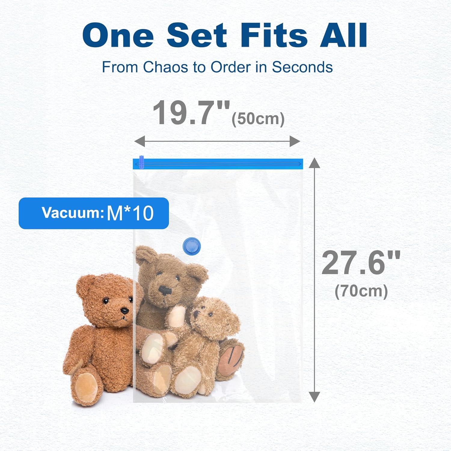Electric Pump Included for Easy Use:The package includes 10 Medium-sized vacuum storage bags and a portable Electric pump. These durable, large-capacity bags pair seamlessly with any standard vacuum cleaner—making them perfect for decluttering at home or keeping belongings organized wherever life takes you
