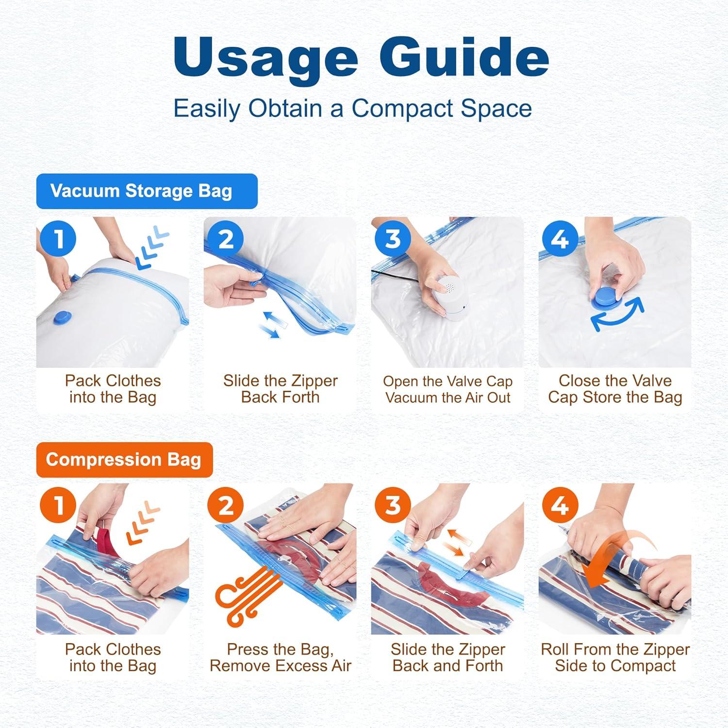 Save 80% Space Effortlessly: Maximize storage efficiency with our vacuum bags! The electric pump removes air in 20-30 seconds, reducing bulky items like blankets, comforters, and seasonal clothes to 20% of their original size. Perfect for decluttering closets, organizing travel luggage, or discreet under-bed storage