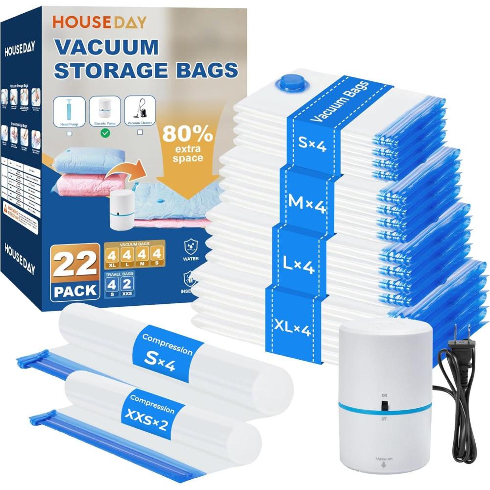 HOUSE DAY 10 Medium Vacuum Seal Bags For Clothing Travel, 80% Space Saving Travel Vacuum Bags with Electric Pump, Vacuum Storage Bags For Clothes, Blankets, Moving, Camping, Toys, Reusable & Durable(22 Combo-E PUMP)