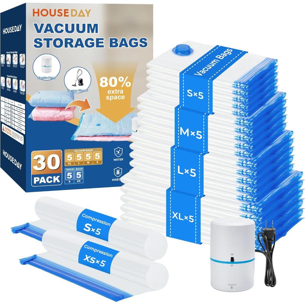 HOUSE DAY 10 Medium Vacuum Seal Bags For Clothing Travel, 80% Space Saving Travel Vacuum Bags with Electric Pump, Vacuum Storage Bags For Clothes, Blankets, Moving, Camping, Toys, Reusable & Durable(30 Combo-E PUMP)
