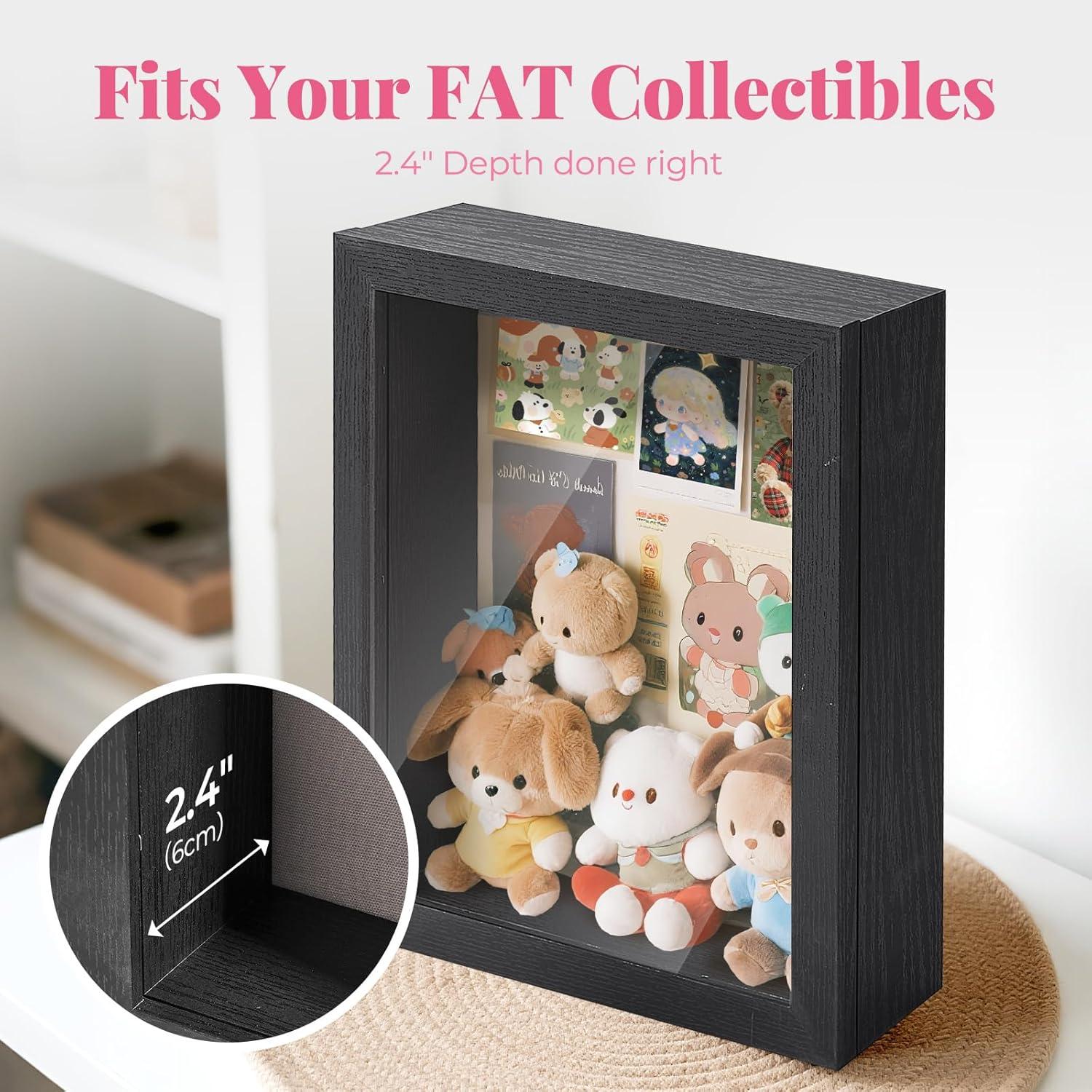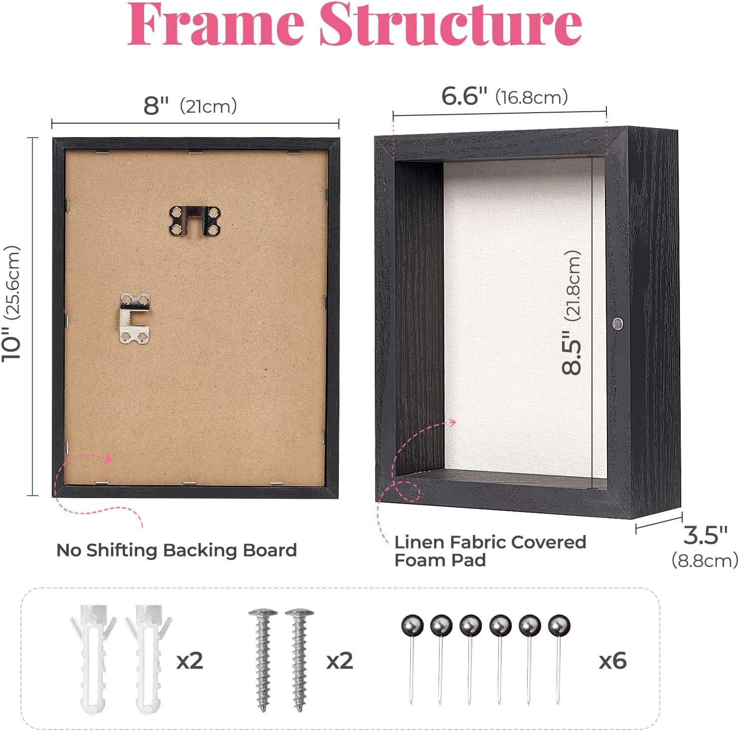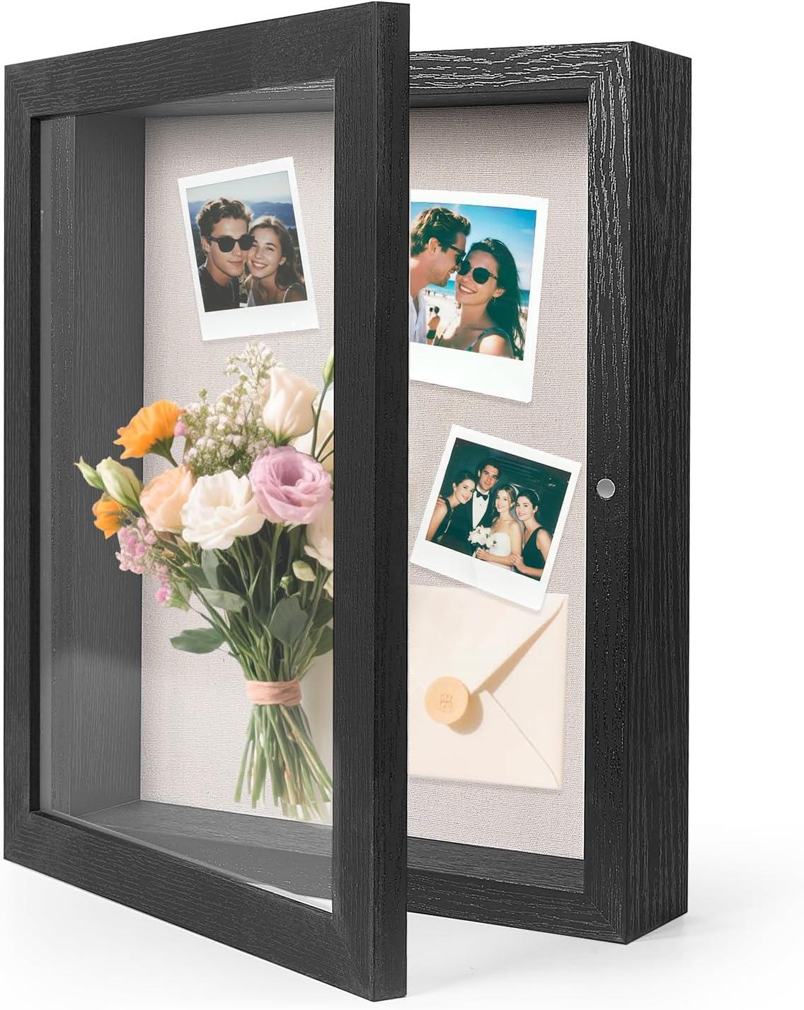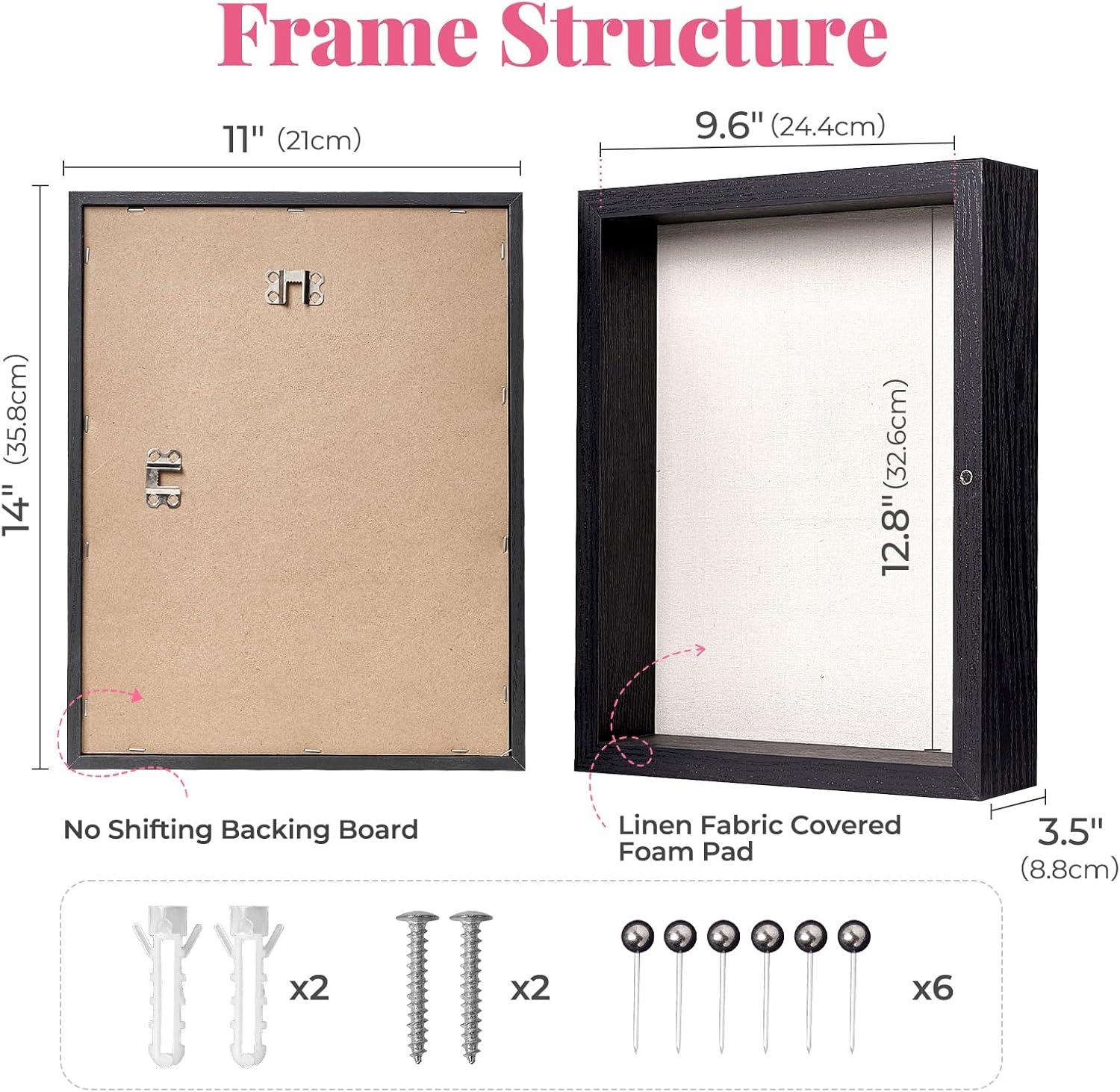 Spacious 11×14 Inch Deep Shadow Box: With a generous 2.4″ inner depth, this clearance shadow boxes display cases displays 3D items like newborn keepsakes, pet memorial, military pins, or dried wedding bouquets beautifully. Use it as a standing keepsake box or wall mount it. Overall size is 11″x14″x3.5″, and its inner size is 12.8″x9.6″x2.4″