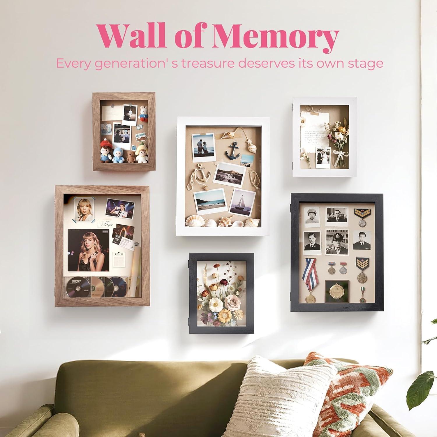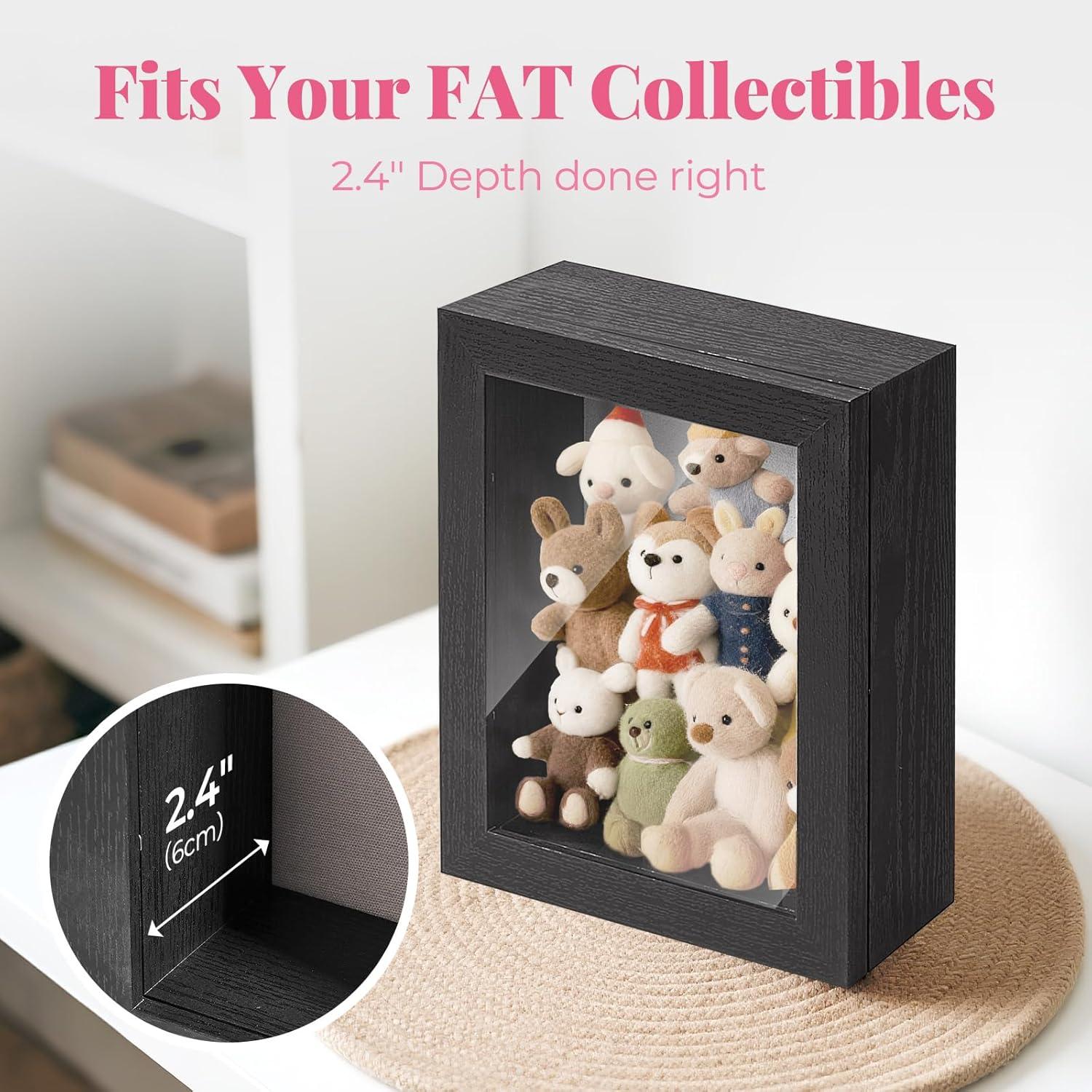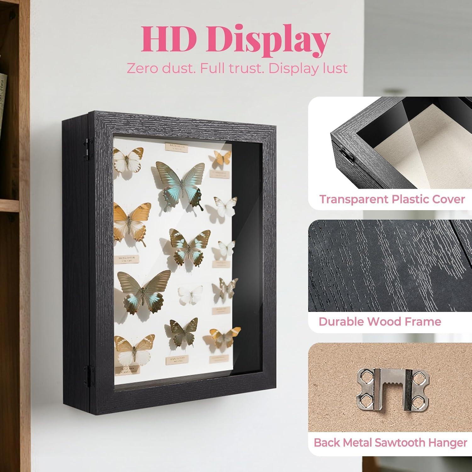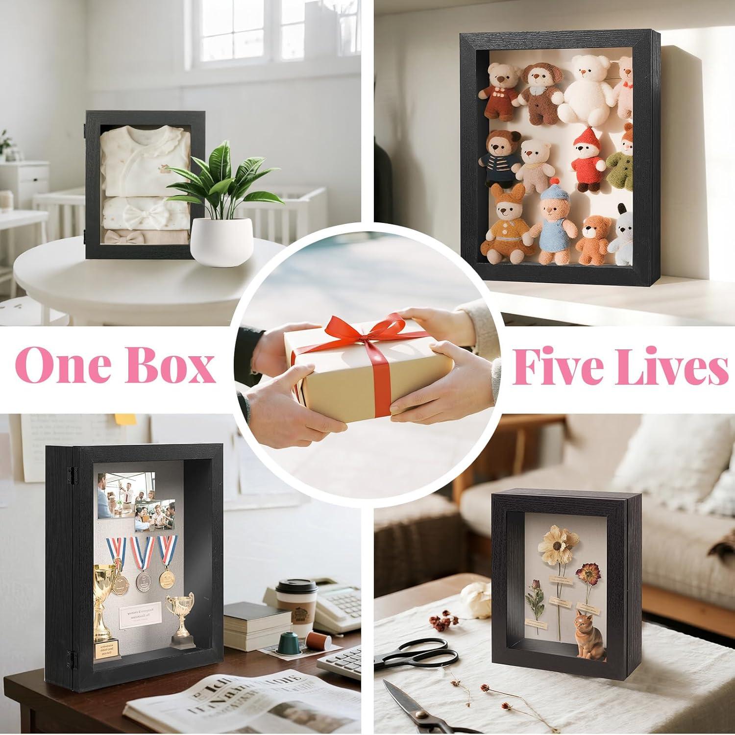 Spacious 11×14 Inch Deep Shadow Box: With a generous 2.4″ inner depth, this clearance shadow boxes display cases displays 3D items like newborn keepsakes, pet memorial, military pins, or dried wedding bouquets beautifully. Use it as a standing keepsake box or wall mount it. Overall size is 11″x14″x3.5″, and its inner size is 12.8″x9.6″x2.4″
