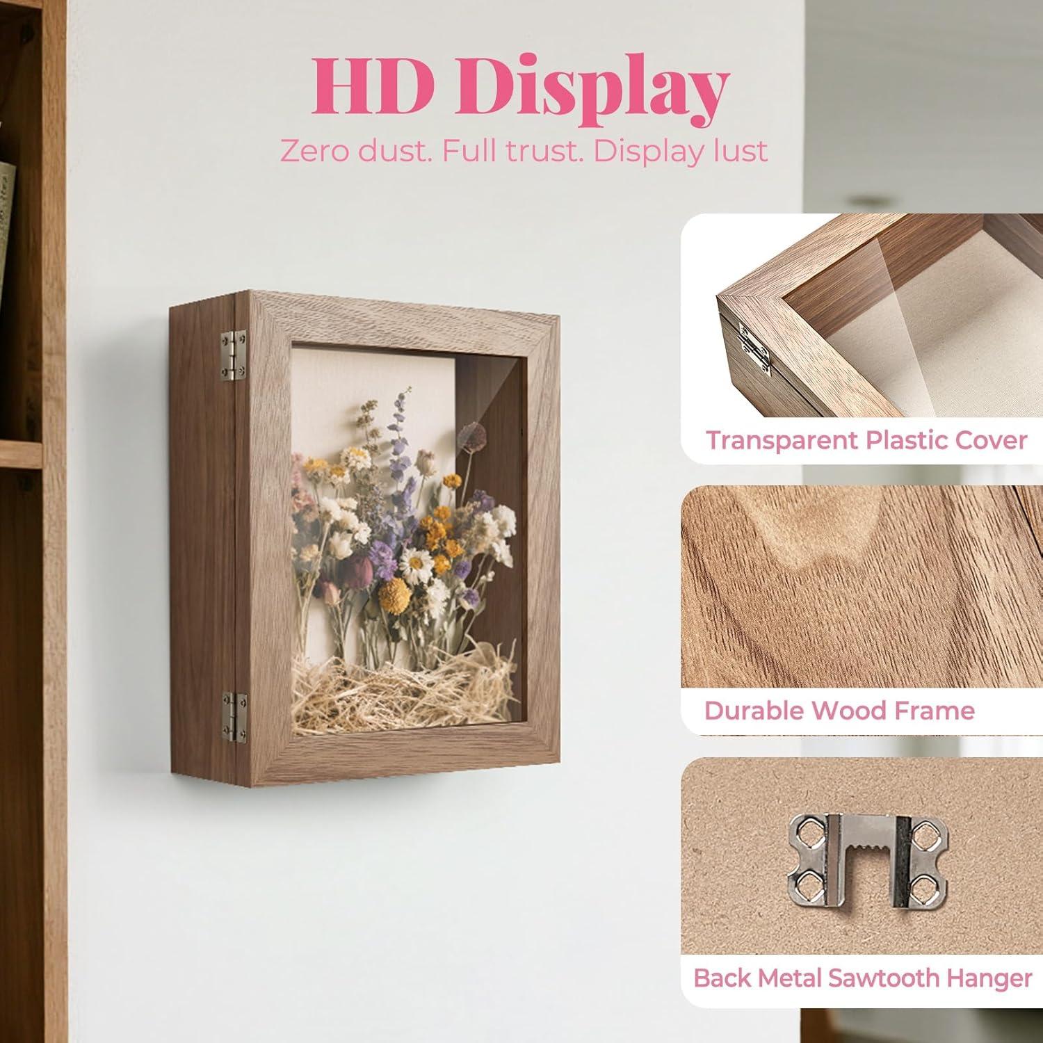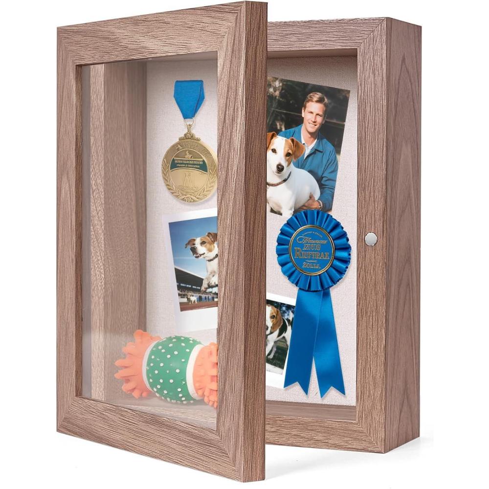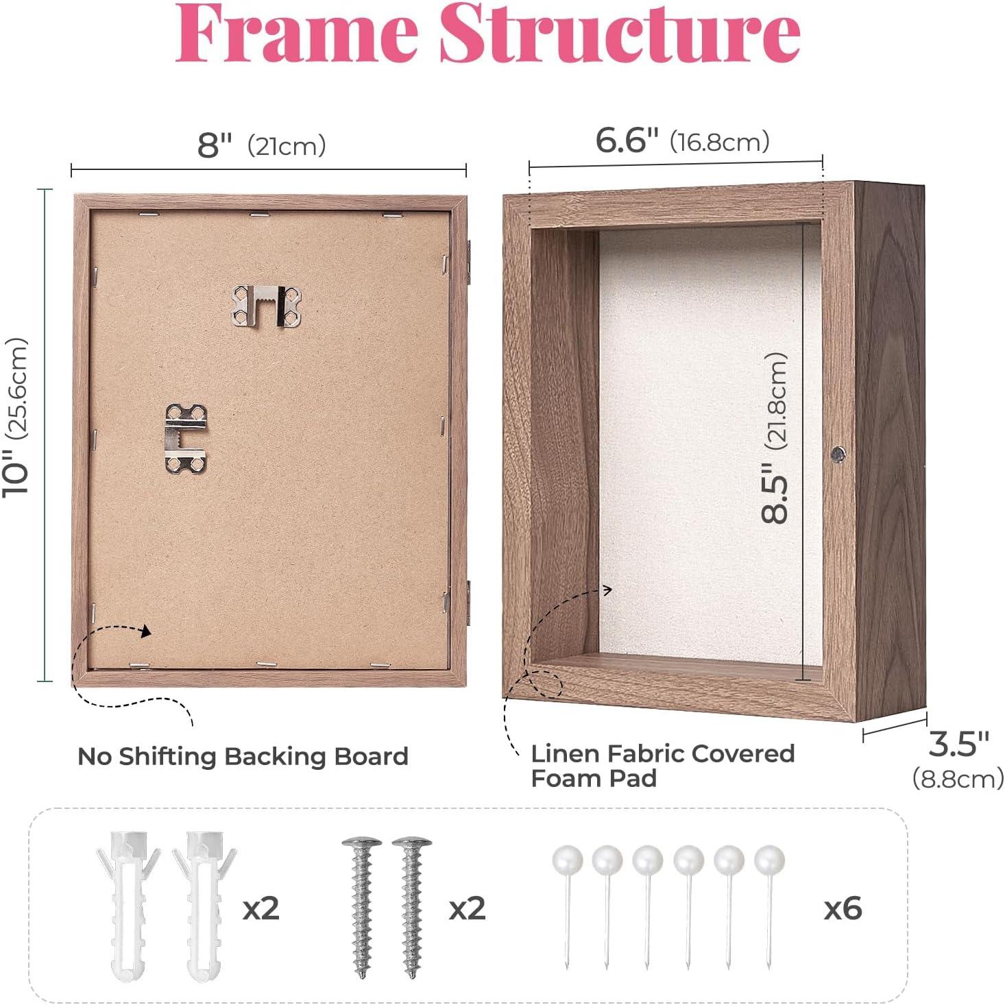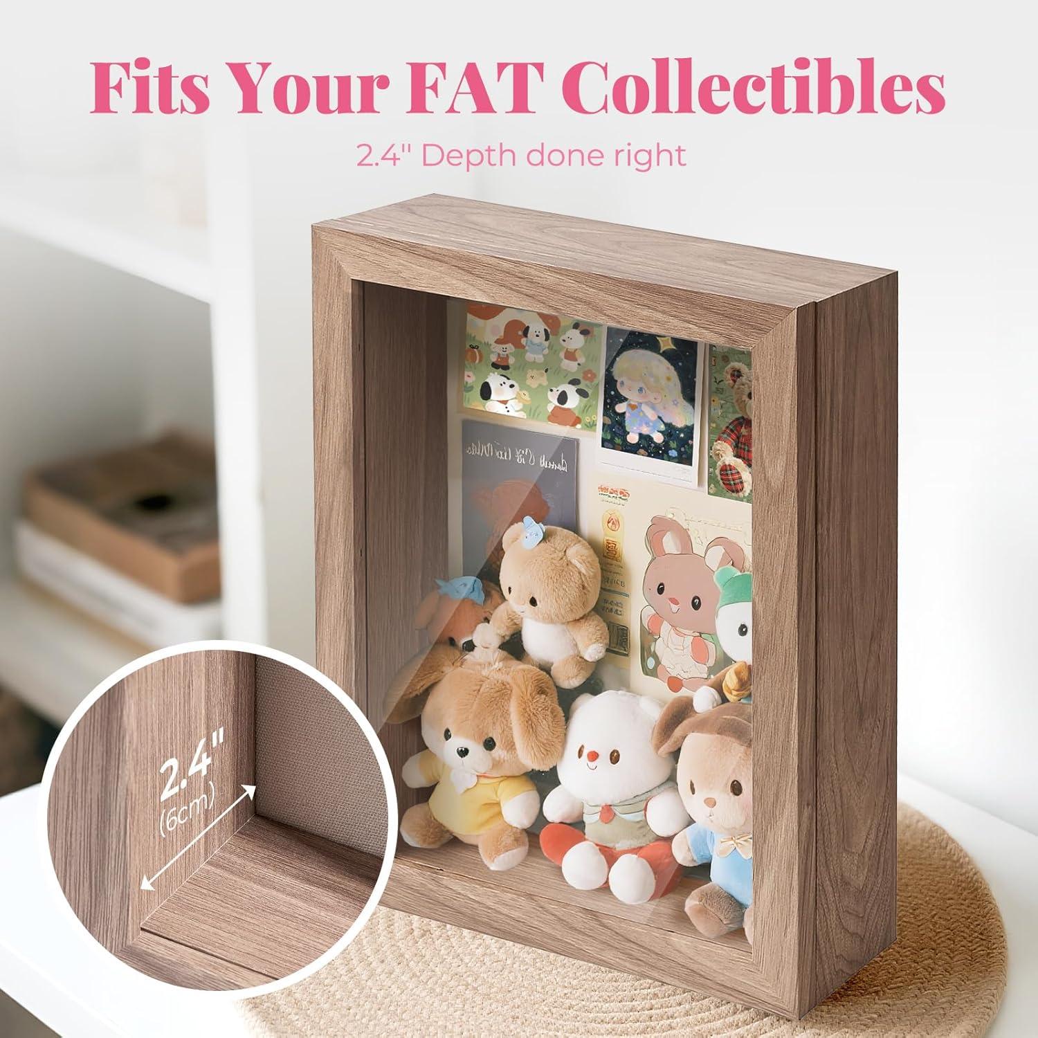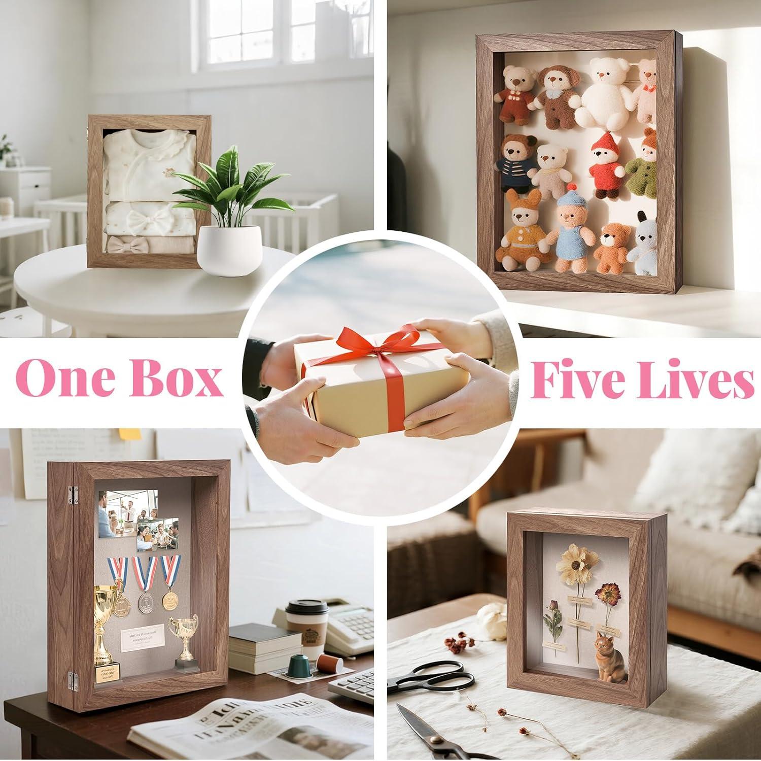Spacious 11×14 Inch Deep Shadow Box: With a generous 2.4″ inner depth, this clearance shadow boxes display cases displays 3D items like newborn keepsakes, pet memorial, military pins, or dried wedding bouquets beautifully. Use it as a standing keepsake box or wall mount it. Overall size is 11″x14″x3.5″, and its inner size is 12.8″x9.6″x2.4″