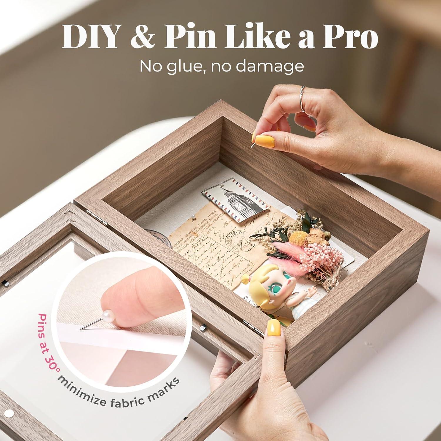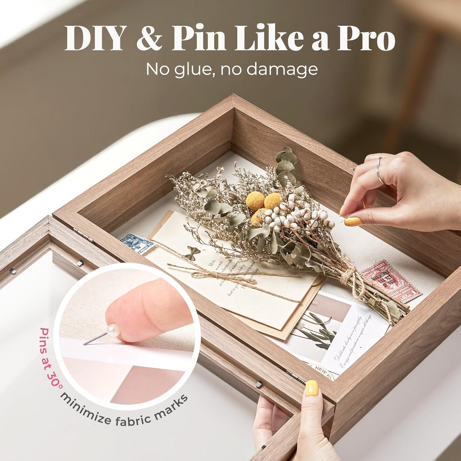 Elegant Linen Display Board: Shadowbox picture frame foam backing board covered in neutral linen fabric & pearl-tipped pins, seamlessly complements your photos, dried flowers, military medals, heirloom jewelry, or travel mementos, and artwork, to create a delightful display