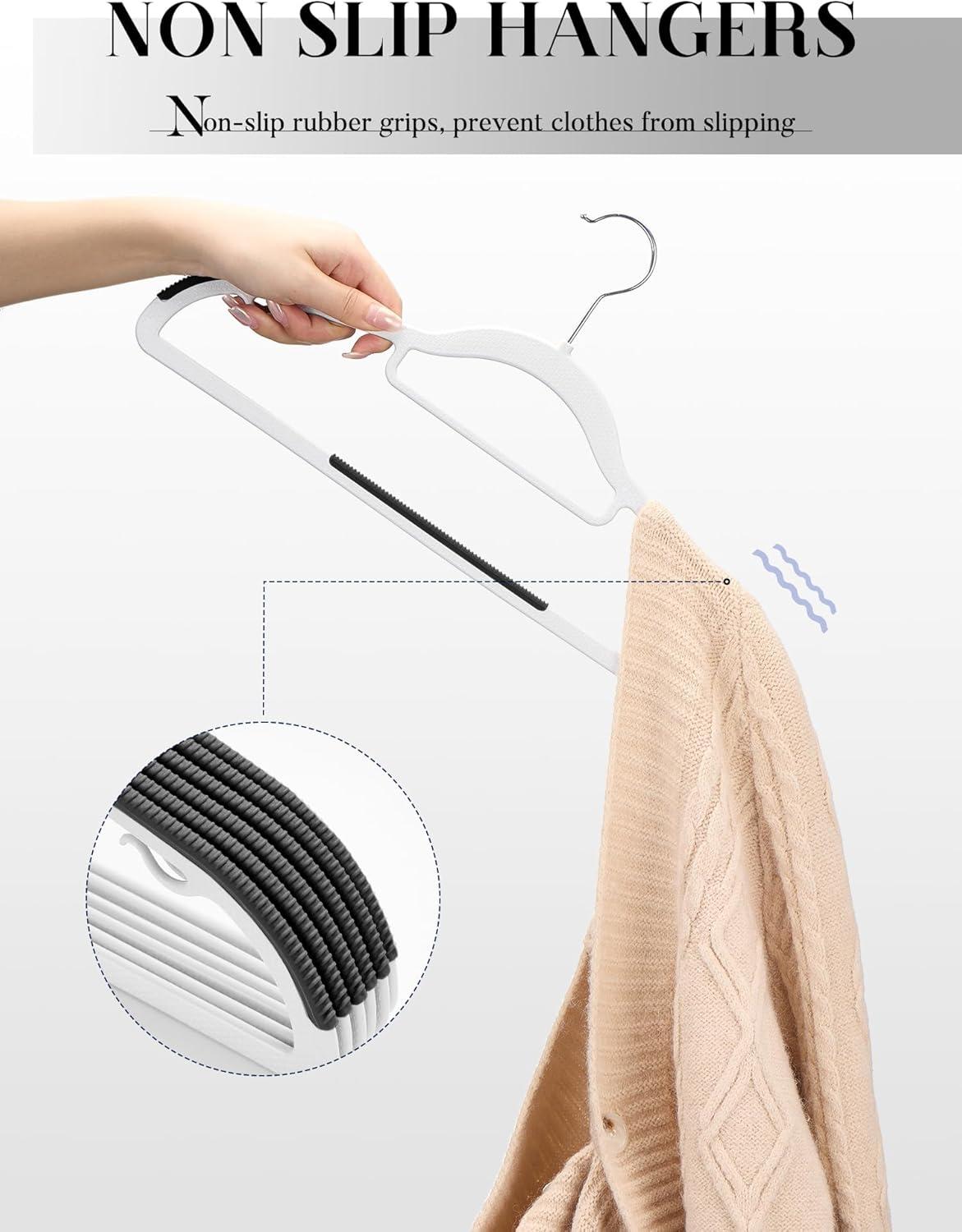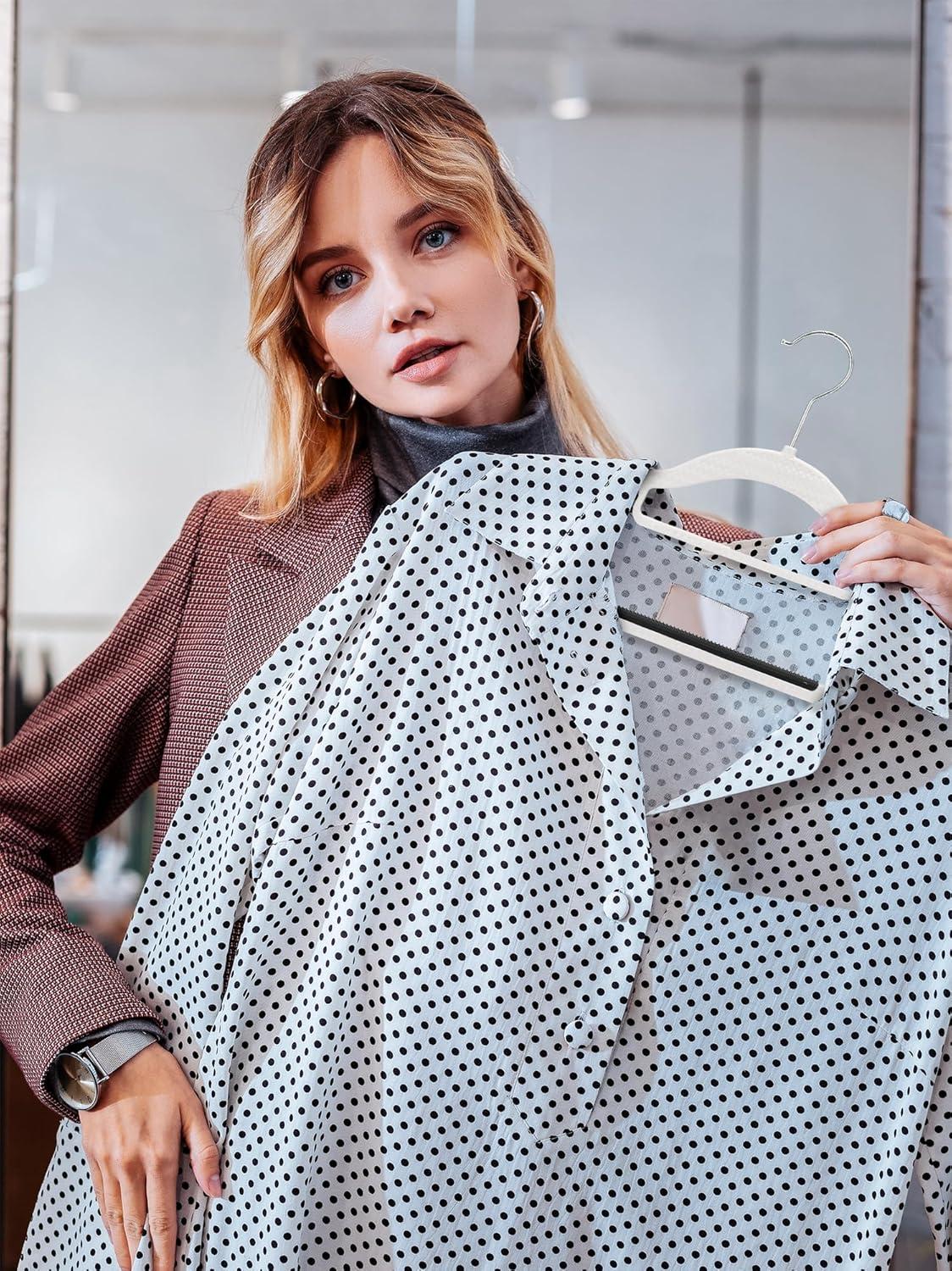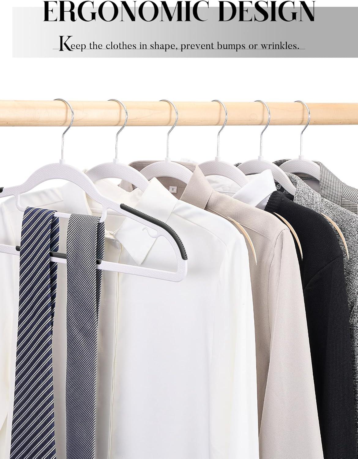 Premium Clothes Hangers 50 Pack: Our coat hangers for closet seamlessly blend functionality with style. Each no slip hangers' surface is thoughtfully designed to eliminate sharp edges that could potentially snag or tear your clothing. With curved shoulders that mimic the natural shape of human shoulders, these hangers prevent fabric from stretching, creasing, or developing indentations, ensuring your clothing remains in pristine condition.