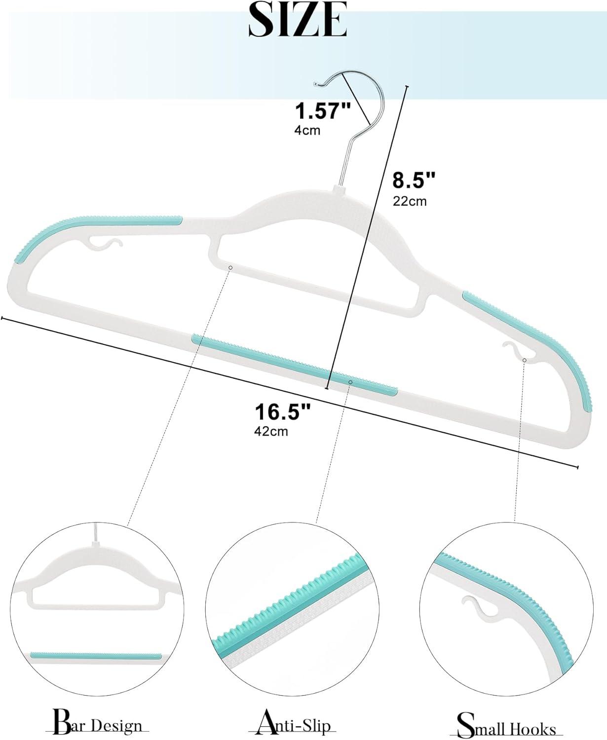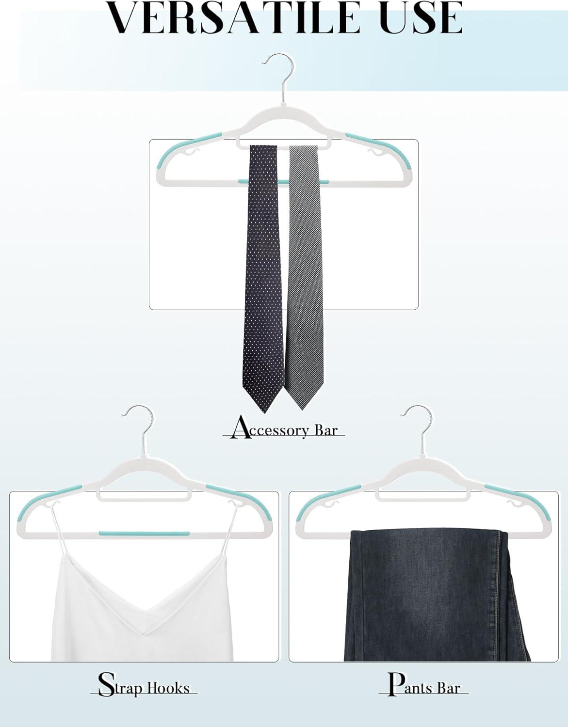 Versatile Clothes Hangers Plastic: These heavy duty hangers for clothes are designed with extra bars to holding accessories like belts, scarves, and ties. The crossbars are tailored for hanging pants, preventing creasing and marks. Moreover, the small hooks on the dress hangers are perfect for garments with shoulder straps. Their remarkable ability to handle multiple items simultaneously makes these thin hangers ideal choice for both closet organizers and storage enthusiasts.