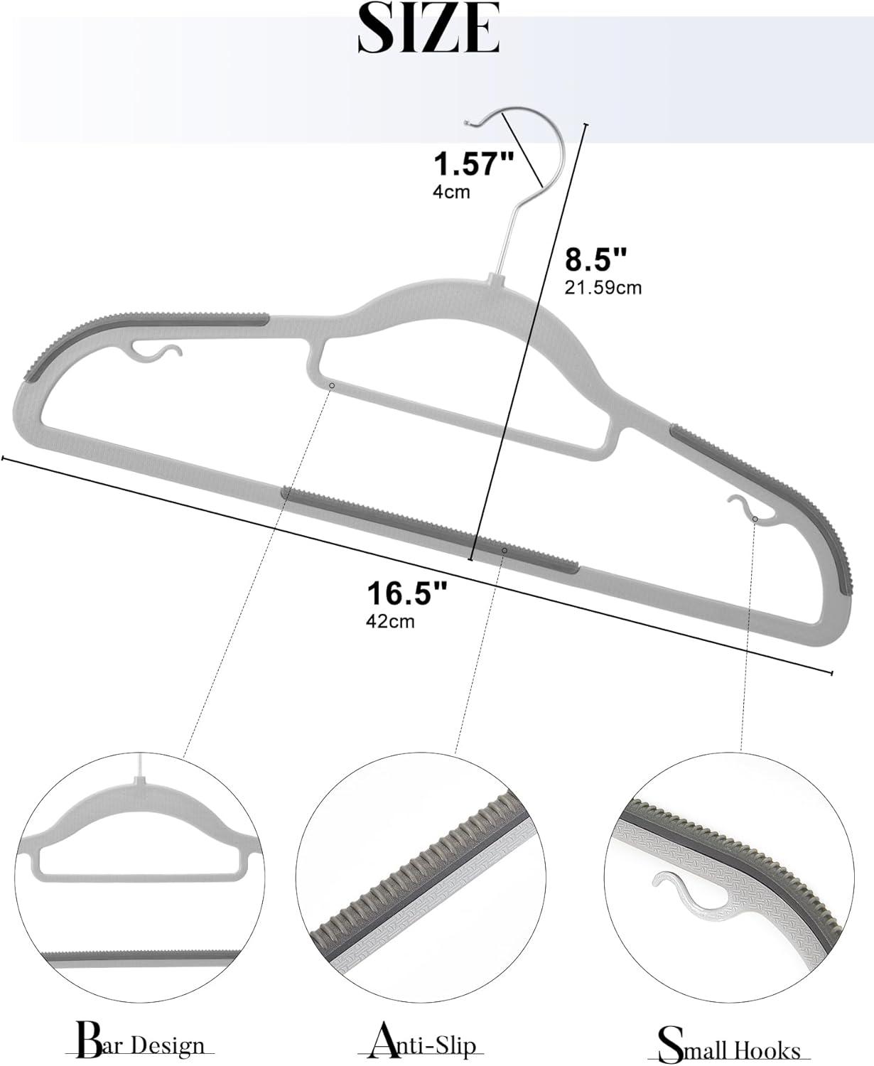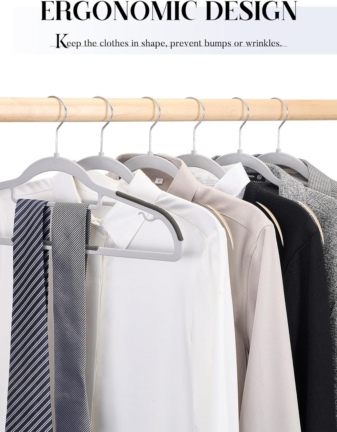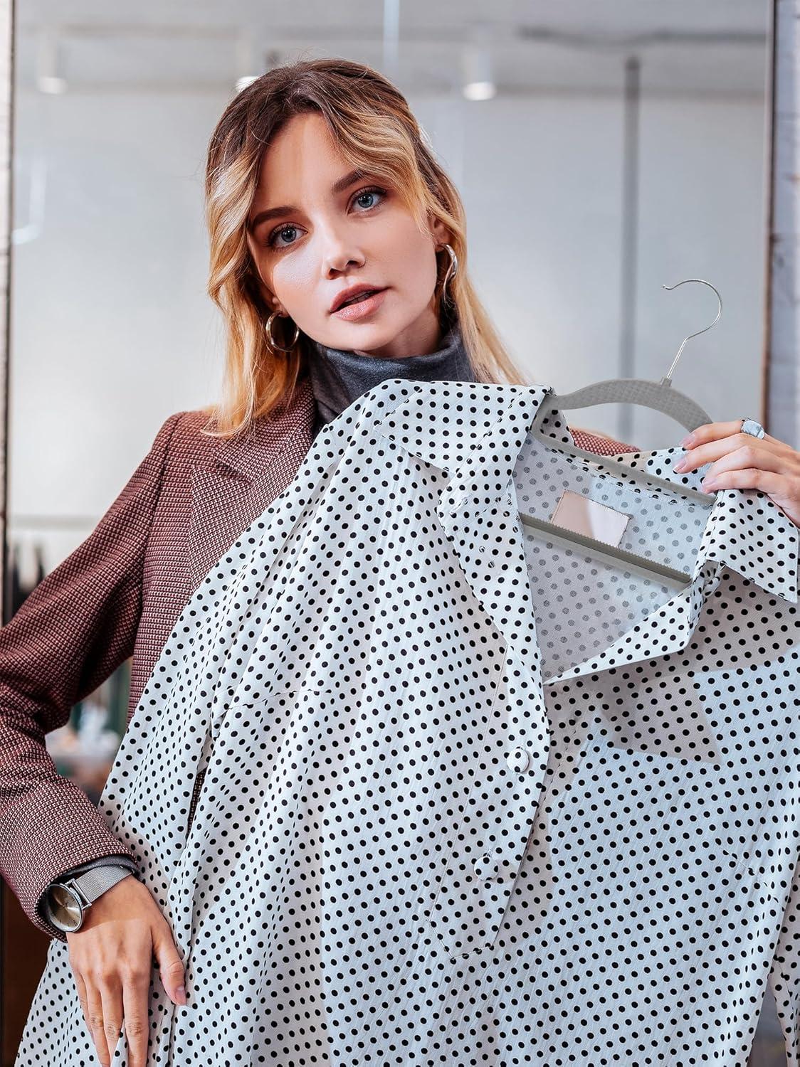 Premium Clothes Hangers 50 Pack: Our coat hangers for closet seamlessly blend functionality with style. Each no slip hangers' surface is thoughtfully designed to eliminate sharp edges that could potentially snag or tear your clothing. With curved shoulders that mimic the natural shape of human shoulders, these hangers prevent fabric from stretching, creasing, or developing indentations, ensuring your clothing remains in pristine condition.