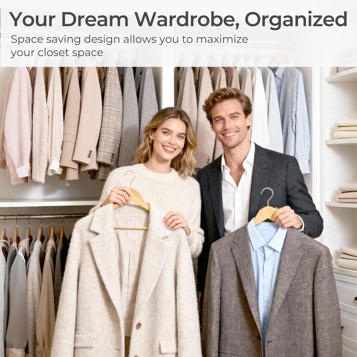 Heavy-Duty Solid Birch Wood – Can holds 15 lbs, Crafted from sustainably sourced solid birch wood, these hangers are built to last. Confidently hang heavy winter coats and suits without worrying about warping or breaking—a lifetime investment that outlasts flimsy plastic hangers