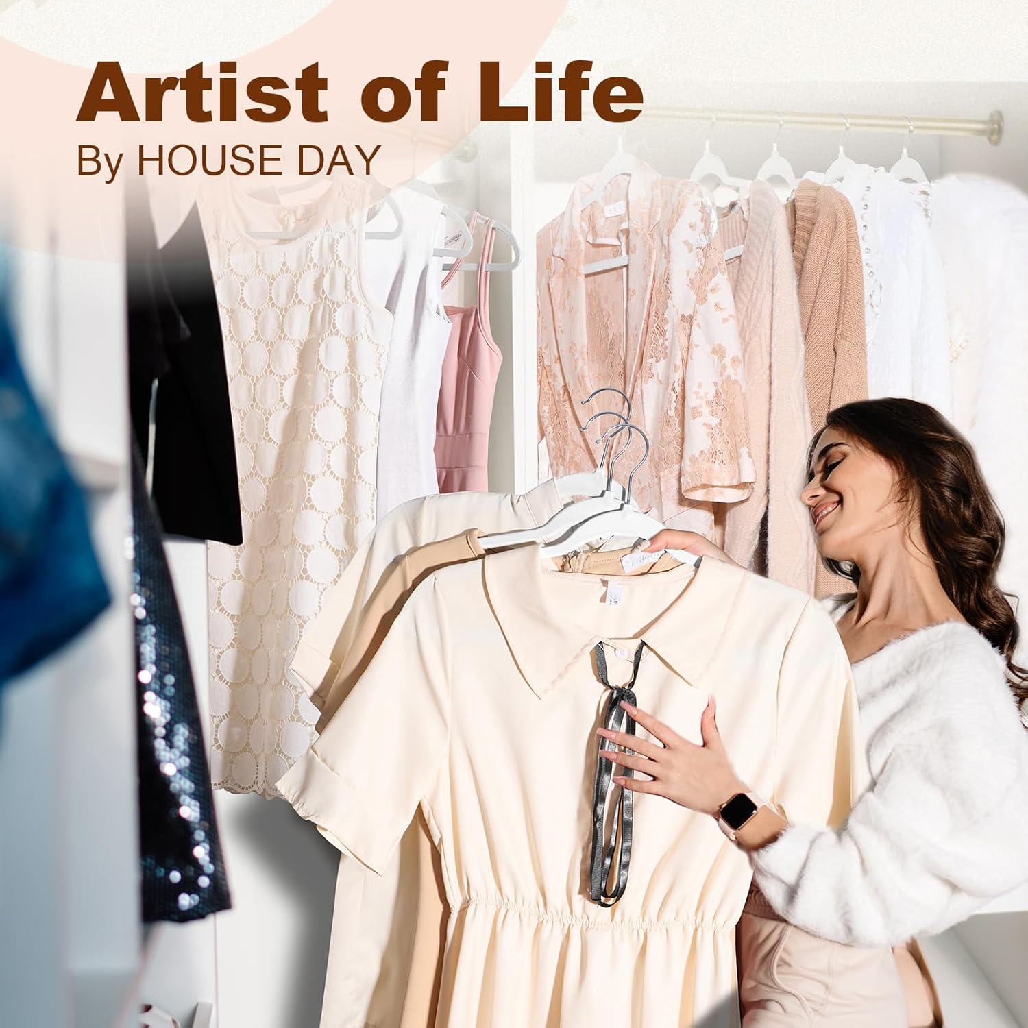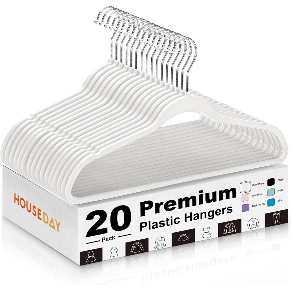 Transform Your Closet with HOUSE DAY's Professional-Grade Hangers Tired of flimsy hangers that ruin your clothes’ shape or snap under weight? Our 60-pack black plastic hangers combine luxury boutique quality with smart functionality: Smarter Than Velvet Hanger Unlike fuzzy hangers that snag delicate fabrics, our polished ABS surface protects silk, satin, and lace while allowing quick outfit changes. Space Multiplication Technology Stack 50% more clothes in the same closet! The ultra-slim profile (0.2” thick) pairs perfectly with our matching skirt/pants hangers for modular organization. Built for Real Life Military-grade ABS plastic resists yellowing & warping Rotating metal hooks glide smoothly on closet rods Reinforced neck prevents “shoulder bumps” on knitwear Perfect for: Heavy coats & blazers Delicate lingerie & camisoles Fold-free pants/skirts with notches Uniform closets (hotels, Airbnbs, retail stores) Included: 100 Grey Hangers (17.5″L x 0.2″W) | Weight Capacity: 10 lbs/hanger