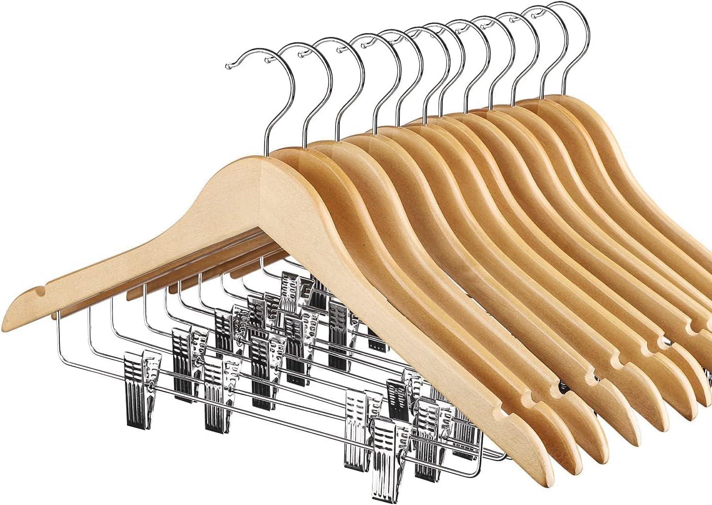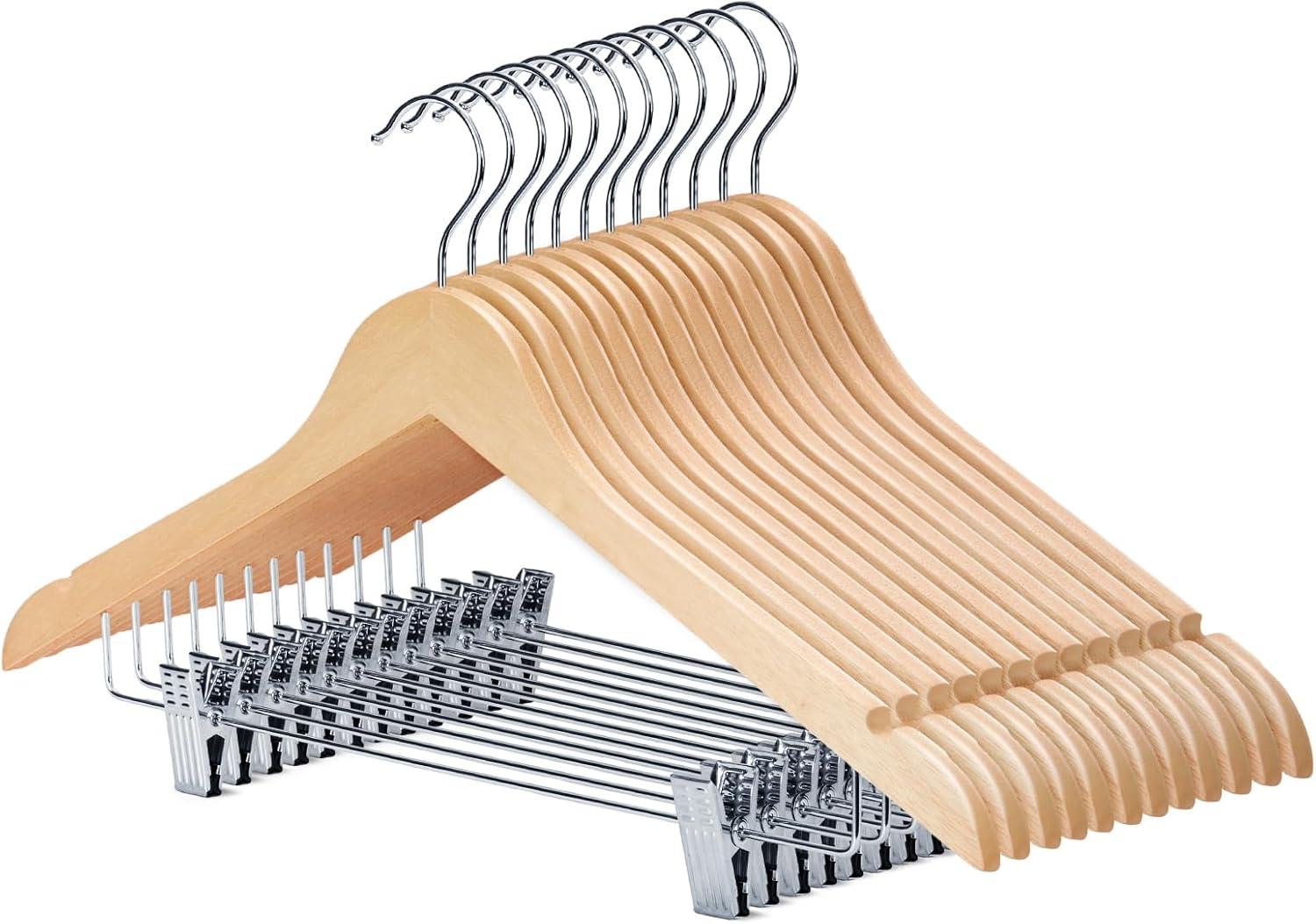 HOUSE DAY Wooden Hangers with Clips 48 Pack,Wooden Suit Hangers Skirt Hangers Solid Wood Pants Hangers Natural Smooth Finish Wood Hangers with Durable Metal Clips for Blouse, Dress, Coat, Jacket(Natural)